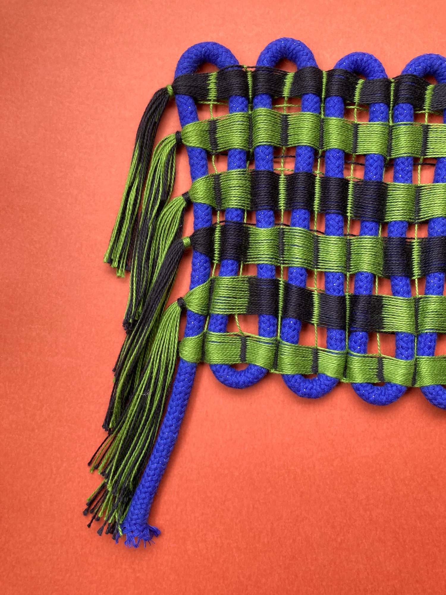'bound to' (2022) a new wall work continues my exploration of abstracting known weaving patterns while weaving with unconventional materials.